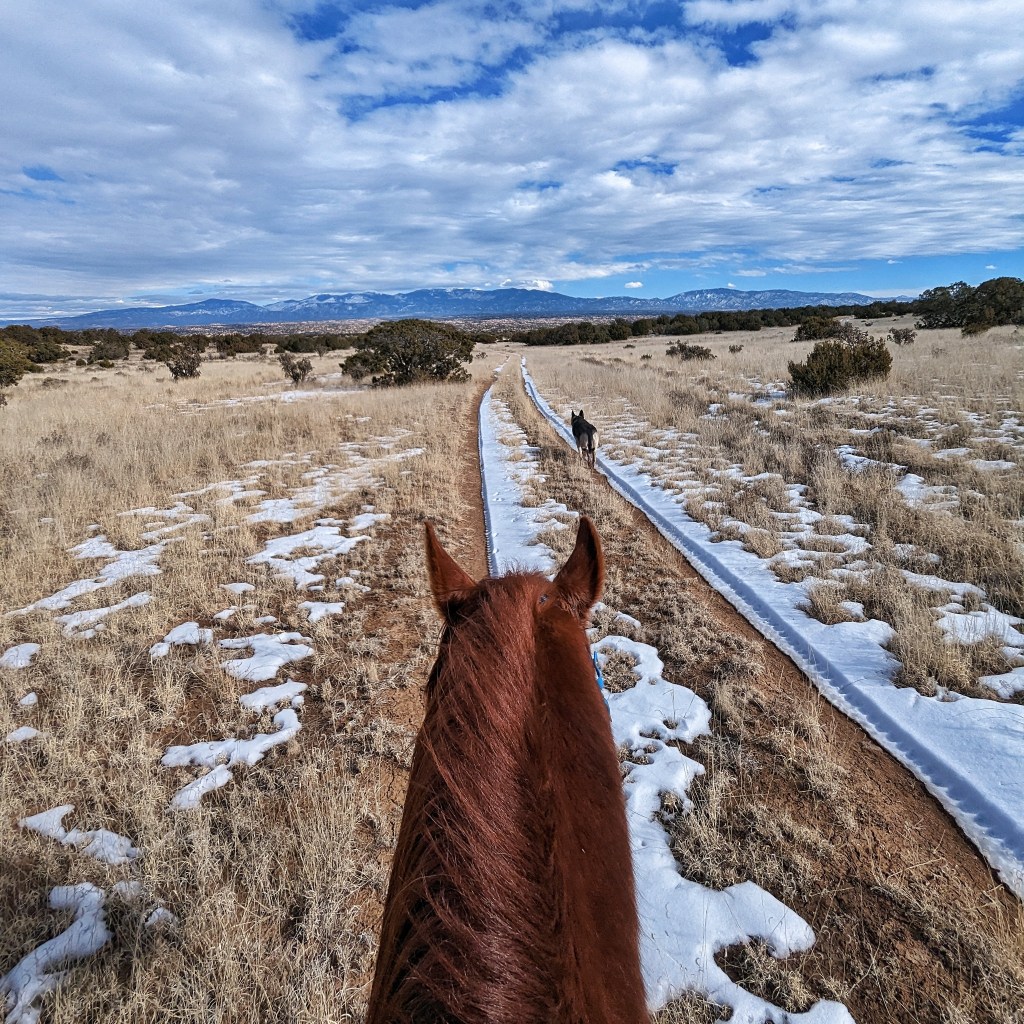 With just under four months to go until the 2023 Caja del Rio Endurance Ride, I took my stallion, Taiyou, out to pre-ride the Vista Loop this past weekend. As the name implies, the Vista Loop is an easy, relatively flat loop filled with panoramic views of the Caja del Rio Plateau to the southwest, the Sangre de Cristos Mountains to the east, and the Jemez Mountains and the Pajarito Plateau to the north.
